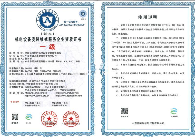 德友鑫-机电设备安装维修服务企业资质证书