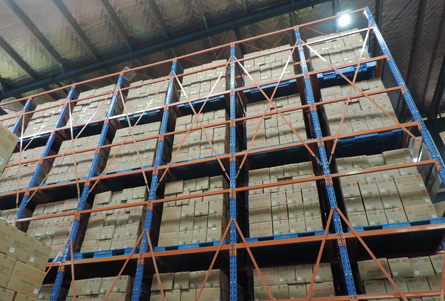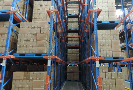 通廊式货架:通廊式货架也称贯通式货架,驶入式货架。为储存大量同类的托盘货物而设计。托盘一个接一个按深度方向存放在支撑导轨上,增大了储存密度,提高了空间利用率