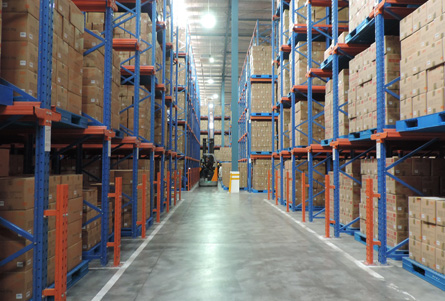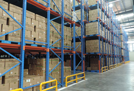 冷链货架:冷库驶入式货架。为储存大量同类的托盘货物而设计。托盘一个接一个按深度方向存放在支撑导轨上,增大了储存密度,提高了空间利用率